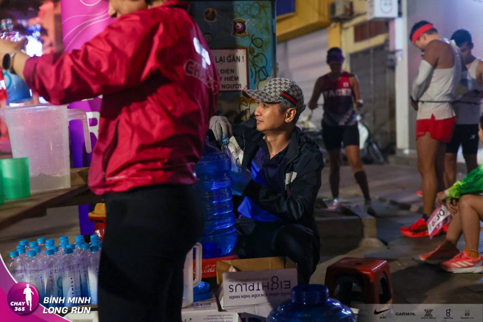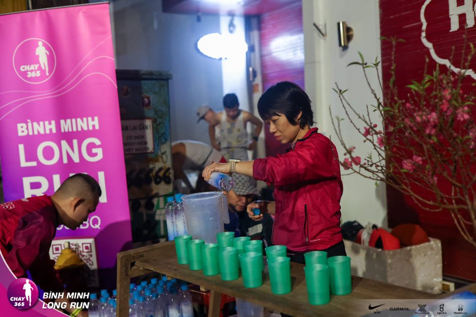 Trạm nước . các anh chị đã tất bật với công việc, chuẩn bị bàn, nước, điện giải, và hoa đào tươi thắm để chờ đón runner.