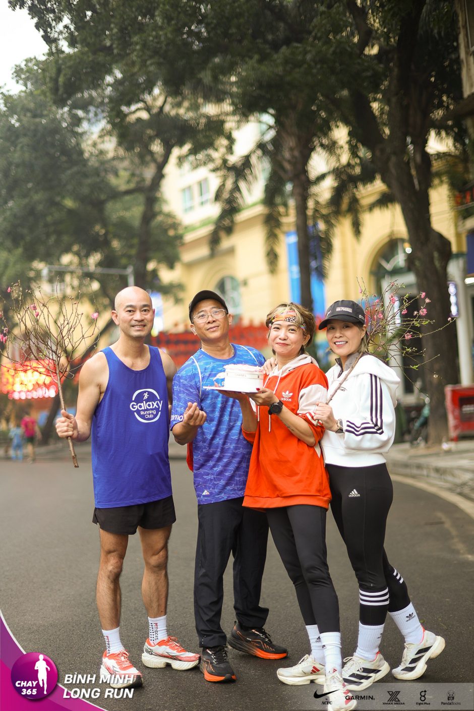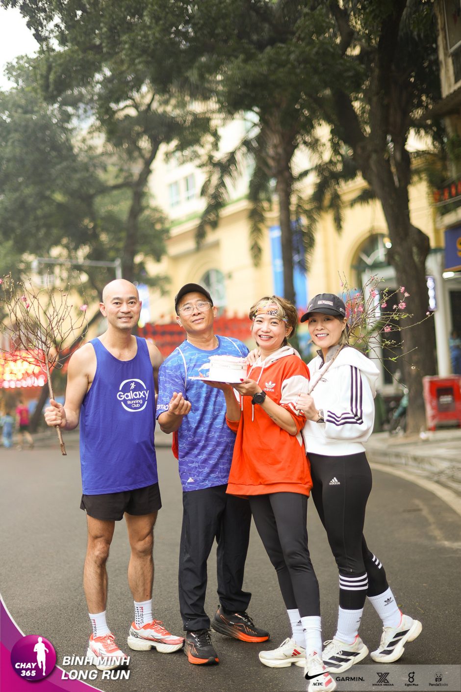 Chay365 Bình Minh Long Run tuần 188: Pacer đeo bib thiết kế Bình Minh Long Run. Lất phất hạt mưa, chị Hạnh cắm cành đào đón chào Xuân Bình Minh mới.