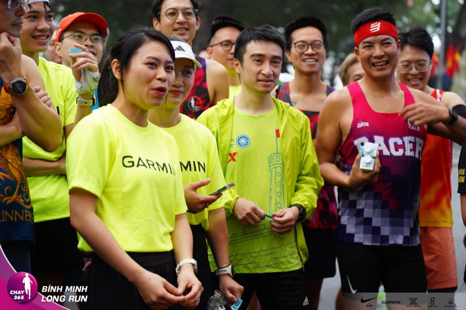 Các bạn đến từ thương hiệu Garmin mặc đồng phục màu xanh lá rất sáng và đẹp. Các bạn mang niềm vui và sự may mắn đến buổi chạy hôm nay.