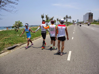 Rồi anh Hòa và bé Trà đi xe máy chạy theo, ku Hiệp cũng xông vô tiếp ứng rồi tranh thủ đang tỉnh táo và còn cười được, chúng tôi làm một tấm hình, tấm hình có lẽ đàng hoàng, hoành tráng nhất trong đoạn chạy, còn lại là những cảnh lê lết đúng nhất nghĩa đen của từ này. Belinda cũng đã vượt qua. Tôi hét to lên cổ vũ cho cổ nhưng quả thật cũng như Caroline trước đó, cô rất tập trung, không phản hồi hay vẫy tay lại. Sau này tôi mới thấy khi cơ thể đã chạm ngưỡng thì gần như mình không thể phản ứng với bất kì cái gì thậm chí cái hi-five với những người bạn ngược đường thì bàn tay cũng như con cá ươn, không còn sức sống.